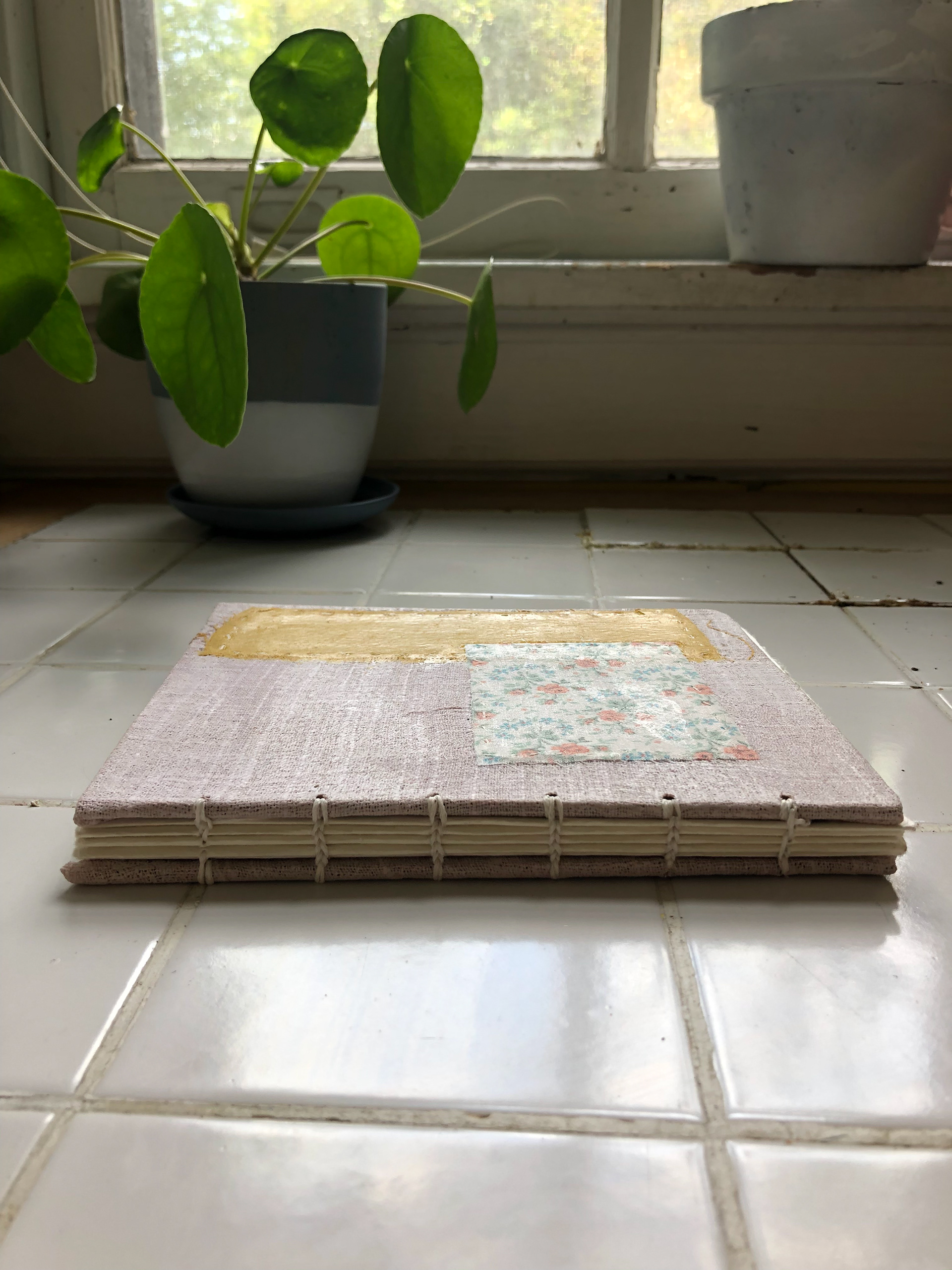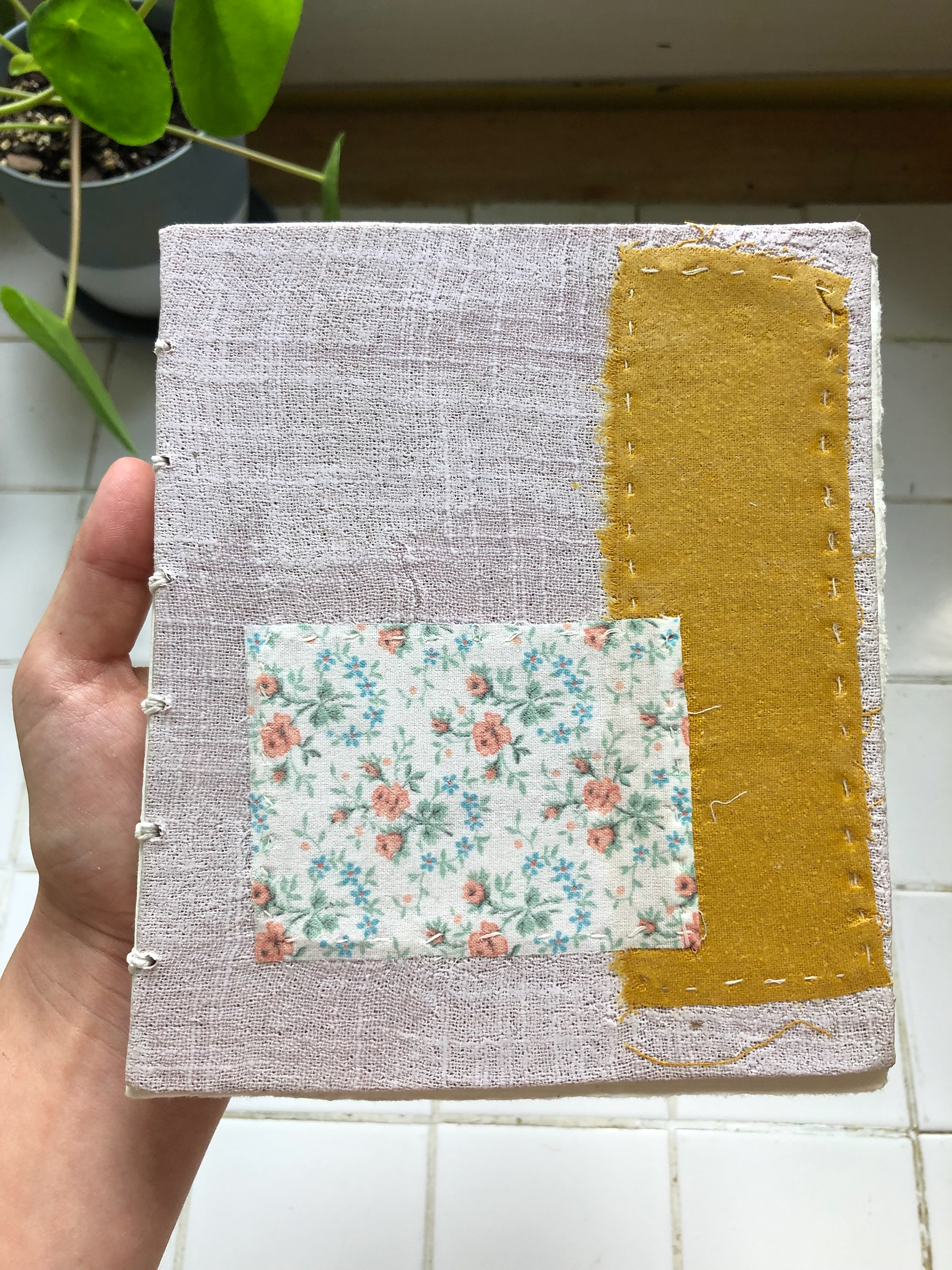 Coptic bound journal with avocado dyed linen, fabric scraps, and Ingres paper - for ideas, dreams, drawings, etc.